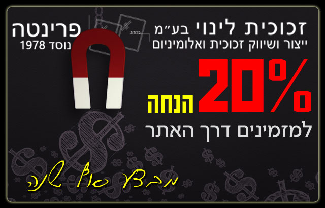 אנו שמחים להעניק ללקוחותינו המגיעים דרך האתר 20% הנחה על כל מגוון מוצרינו להזמנות בחודש ינואר 2016
